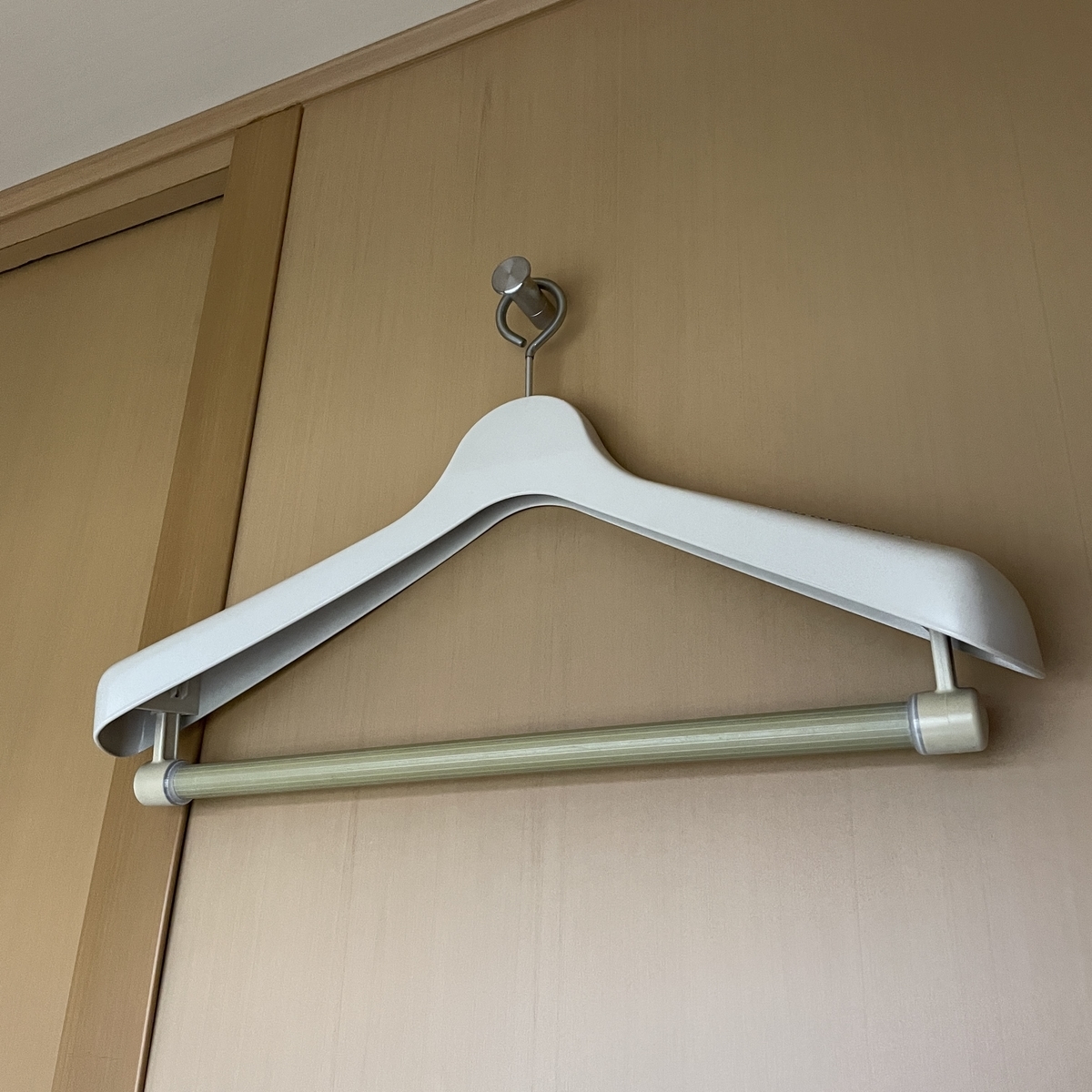 ハンガーはかなりしっかりとした形でスーツをかけても型くずれがしにくい幅のものになっています。