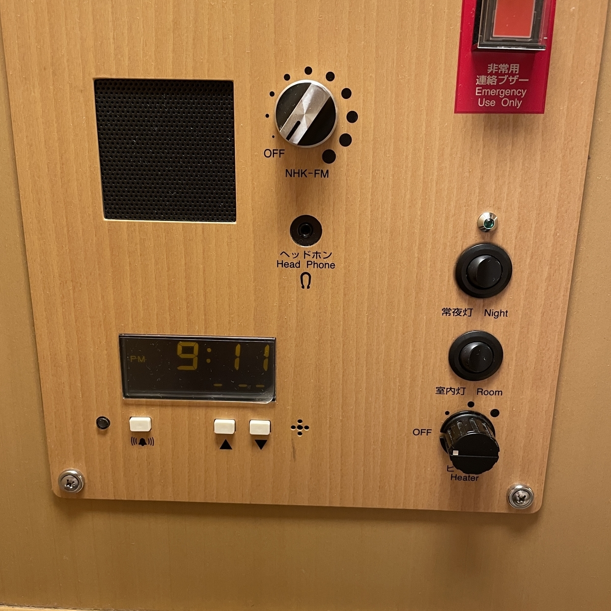 コントロール部はこのような作りになっています。室内灯と小さい明かりの常夜灯のスイッチ、冬場用のヒーター、ラジオ、目覚ましがあります。