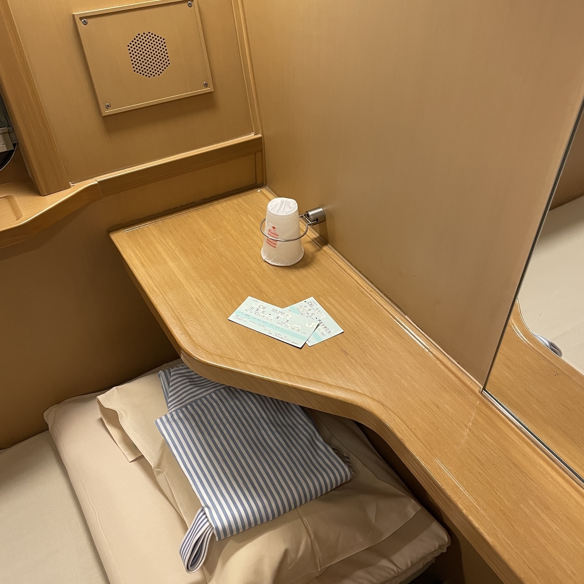 心地よい車両の揺れで眠りにつき、しばらくして目を開けるとまだ静岡のようでした。部屋に備え付けのスピーカーから少し小さい車内放送が聞こえてきます、、、