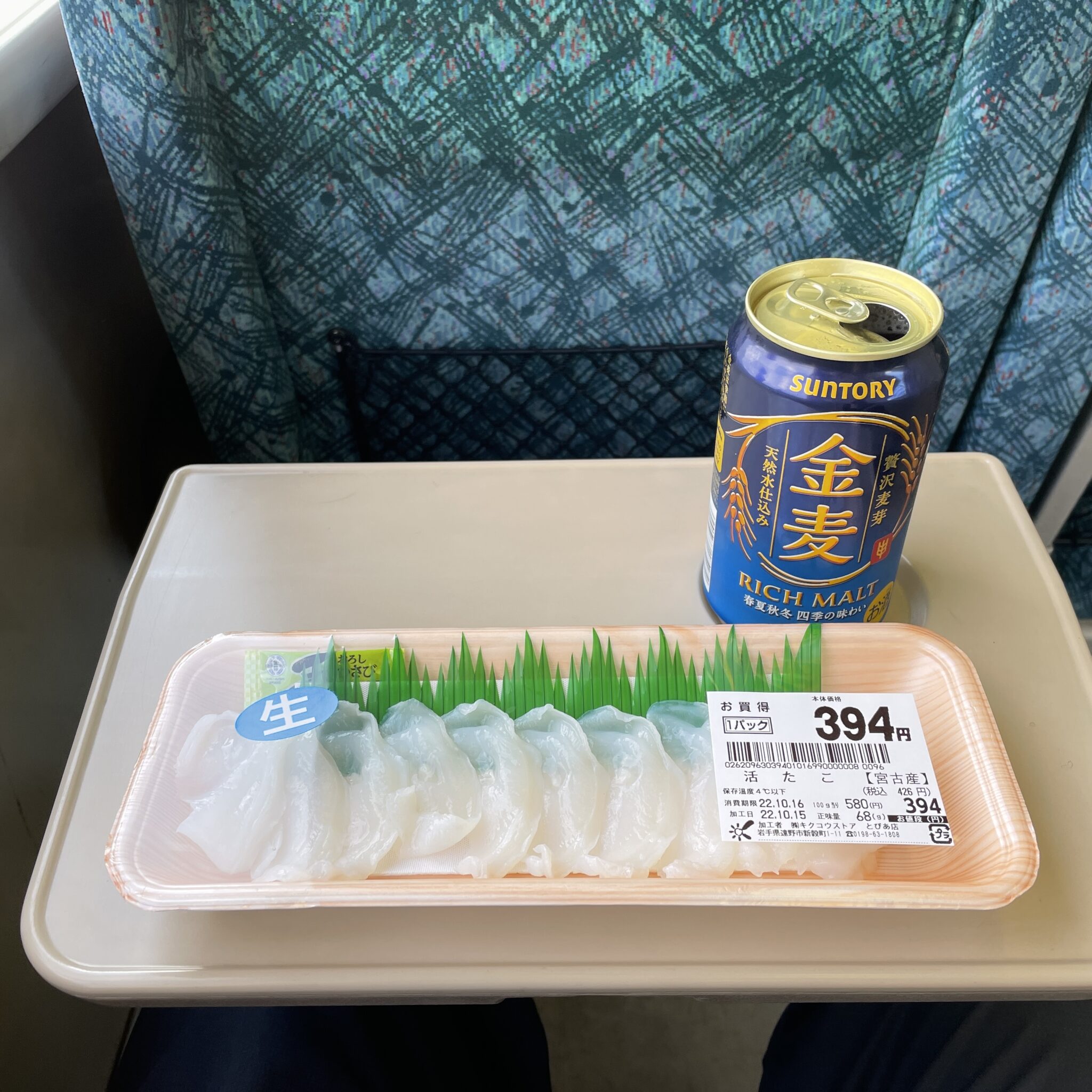 遠野からの帰りも同じく快速はまゆりの指定席に乗車して、快適な移動になりました。スーパーで購入した宮古のたこはプリプリで新鮮そのもの!こういった食事ができるのも指定席の良さですね。