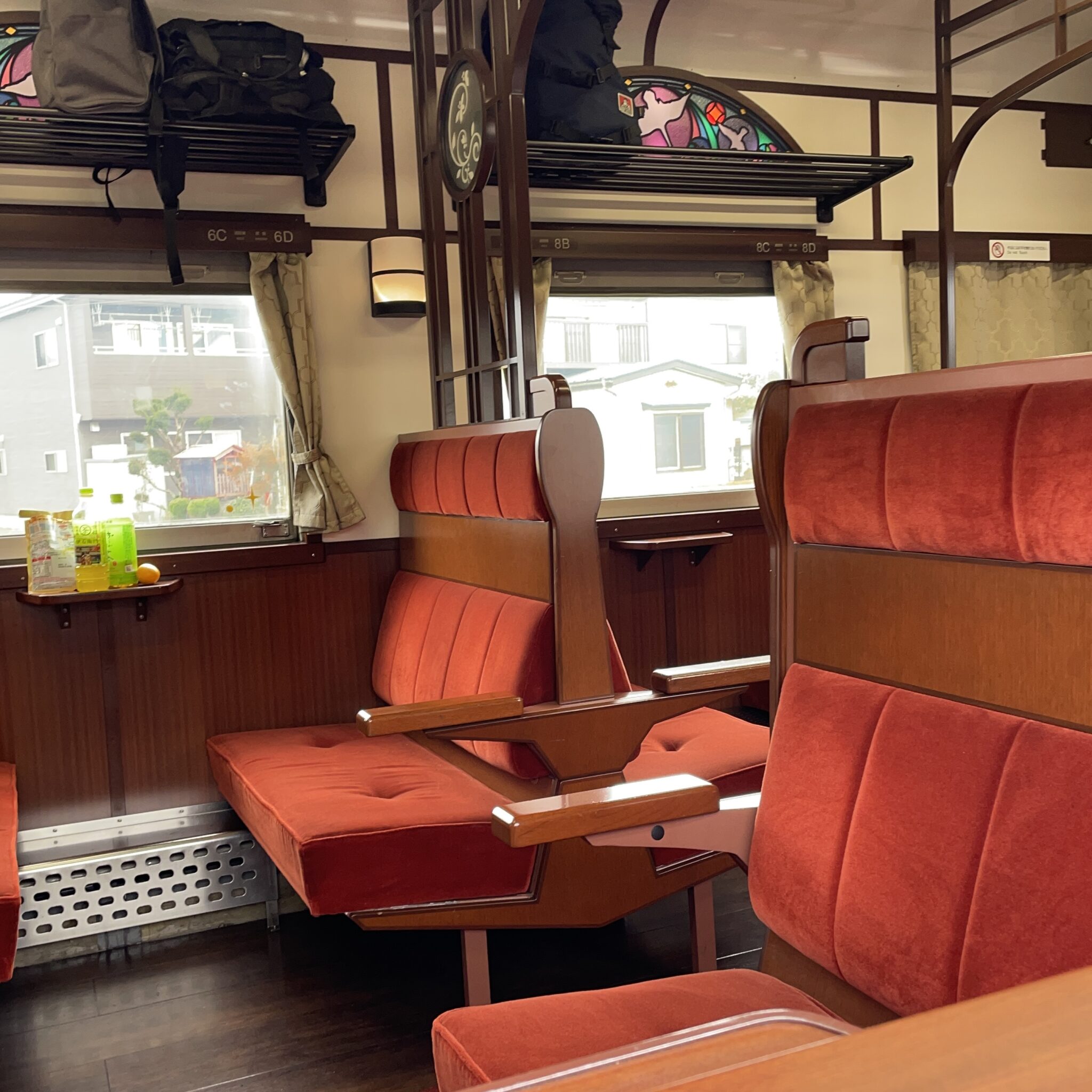 赤いシートとステンドグラスの装飾が列車旅の旅情を掻き立ててくれますね。乗車できた人はとてもラッキーだと思います。