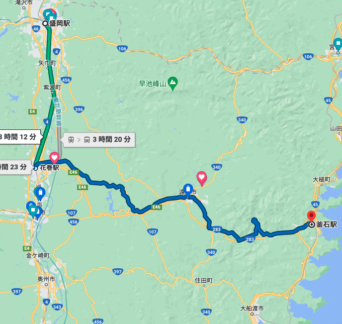 盛岡駅から花巻駅までは東北本線ですが、快速はまゆりは盛岡駅からそのまま釜石線へ乗り換えすることなく釜石まで行くことができます。