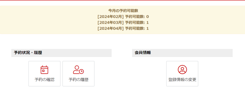 アカウントの予約可能回数については、予約ページのマイページから確認することができます。