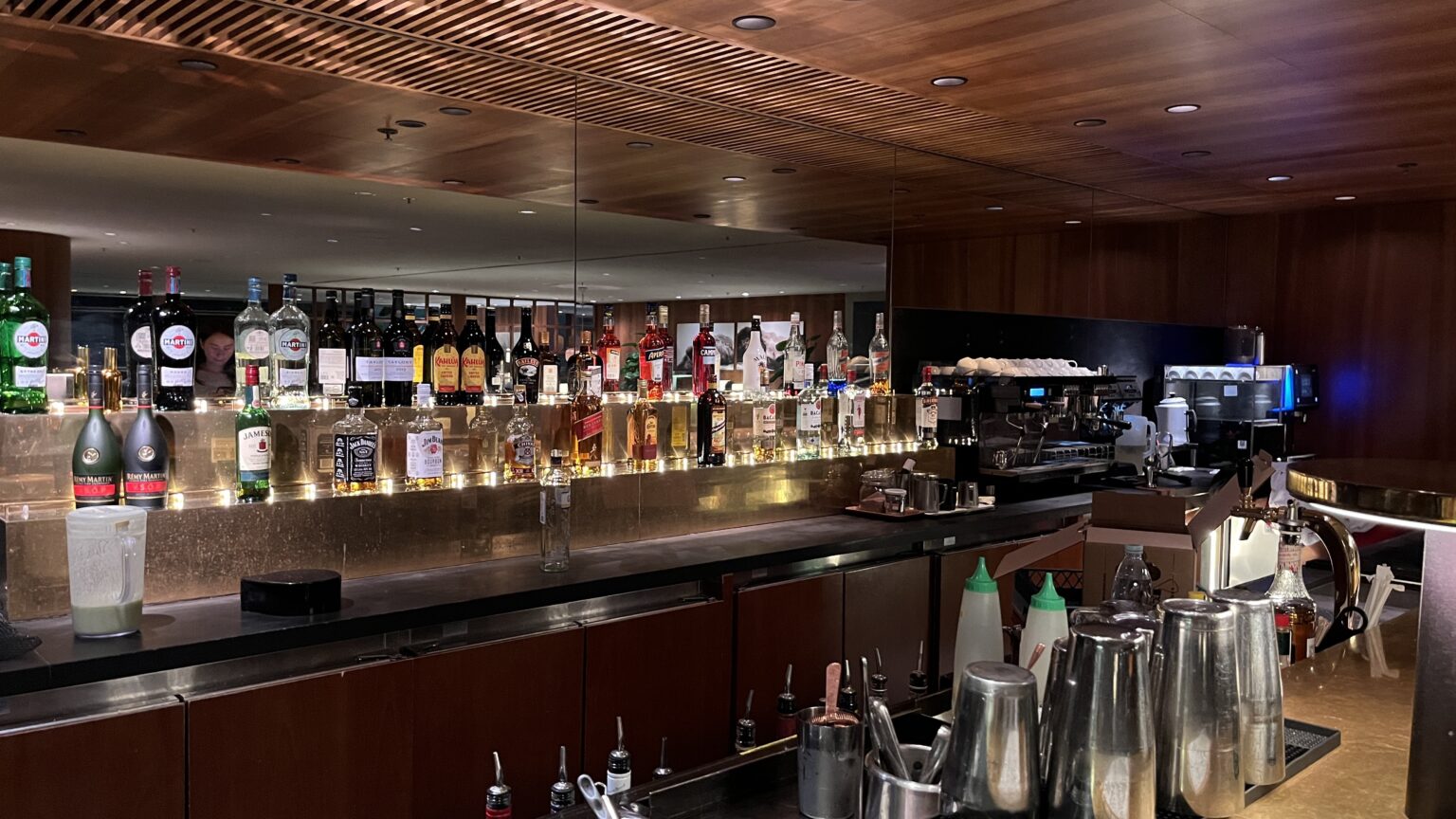 間接照明が多数使われ、木目調の落ち着いたインテリアが特徴で、高級感のある雰囲気の中でゆっくりと過ごせます。他のラウンジよりもプライベート感があり、静かな環境を好む方にぴったりです。