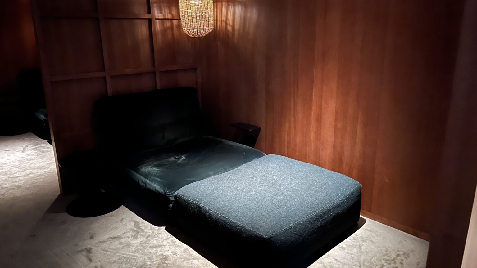 ラウンジ内には静かに過ごせるリラックスエリアがあり、落ち着いた照明と快適なソファが設置されています。