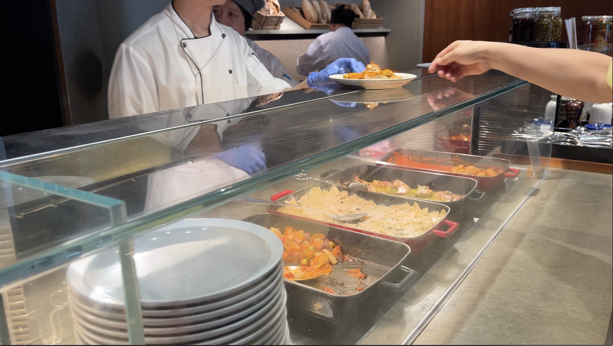 ビジネスクラスラウンジのレストランエリアは半ビュッフェスタイルで提供されており、利用者は欲しいメニューをスタッフに伝えて料理を選ぶことができます。
