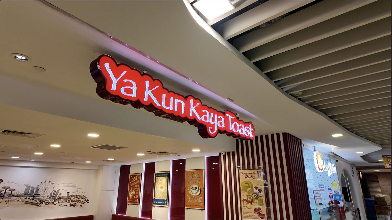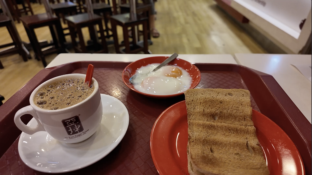 朝食を食べに行ったのは、シンガポールの伝統料理であるカヤトーストです。カヤトーストとは、炭火で焼いたトーストにカヤジャムと呼ばれるココナッツミルクをベースにした甘いペーストを塗って食べる料理です。