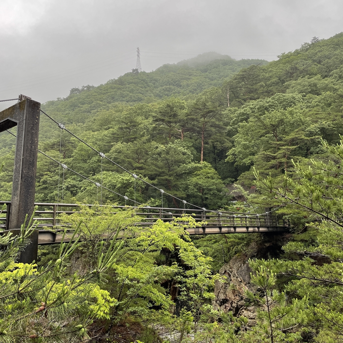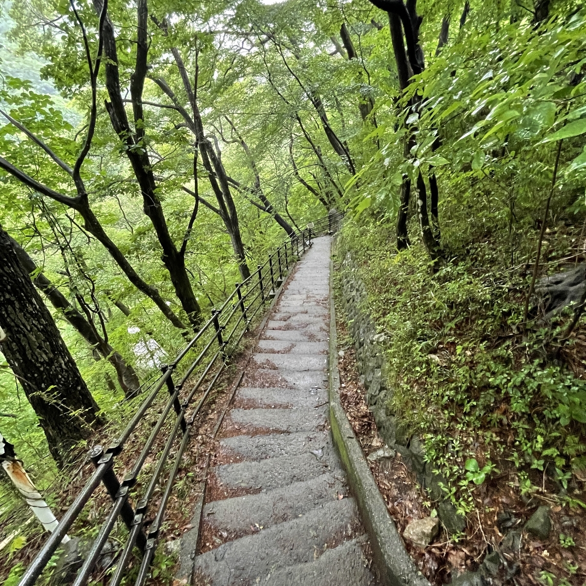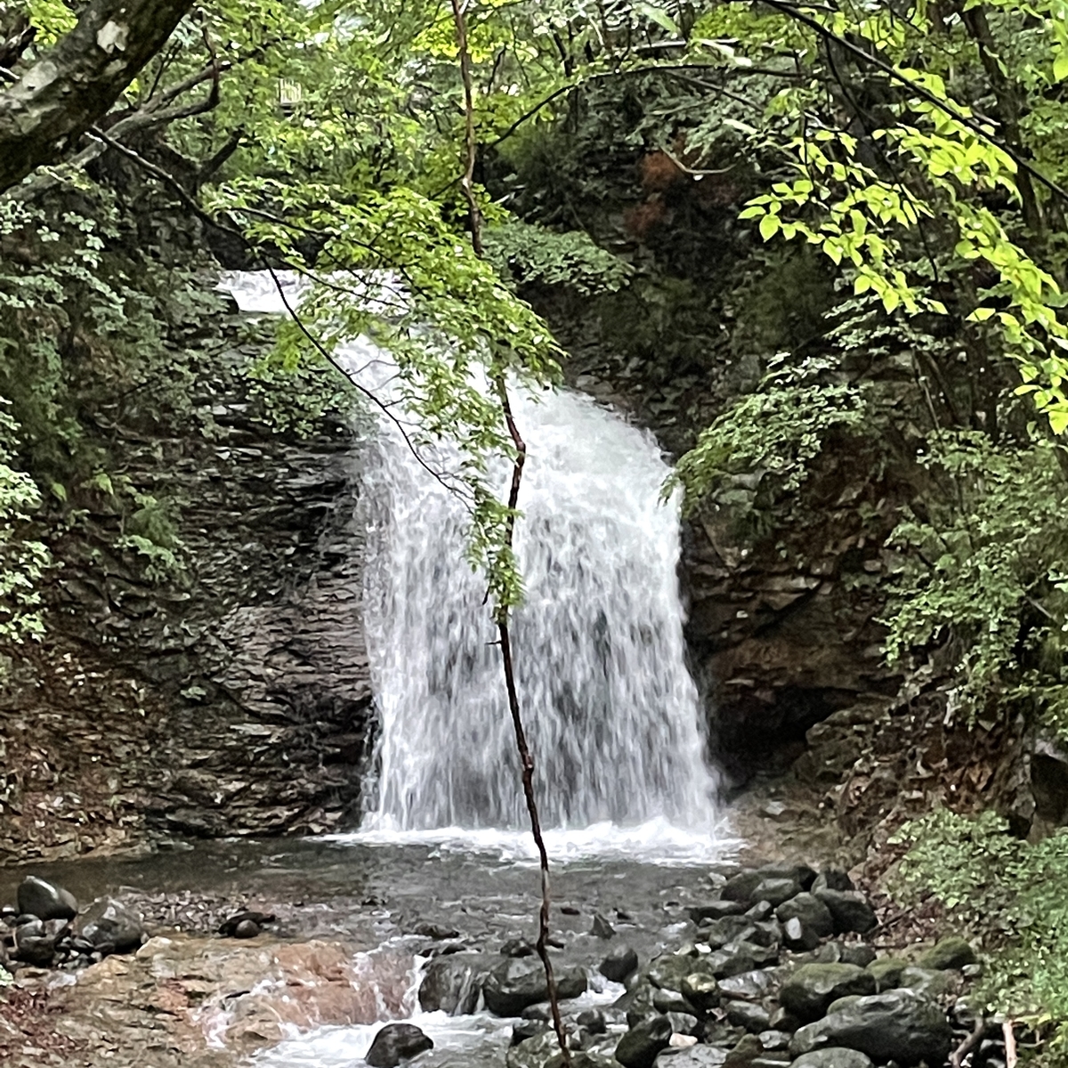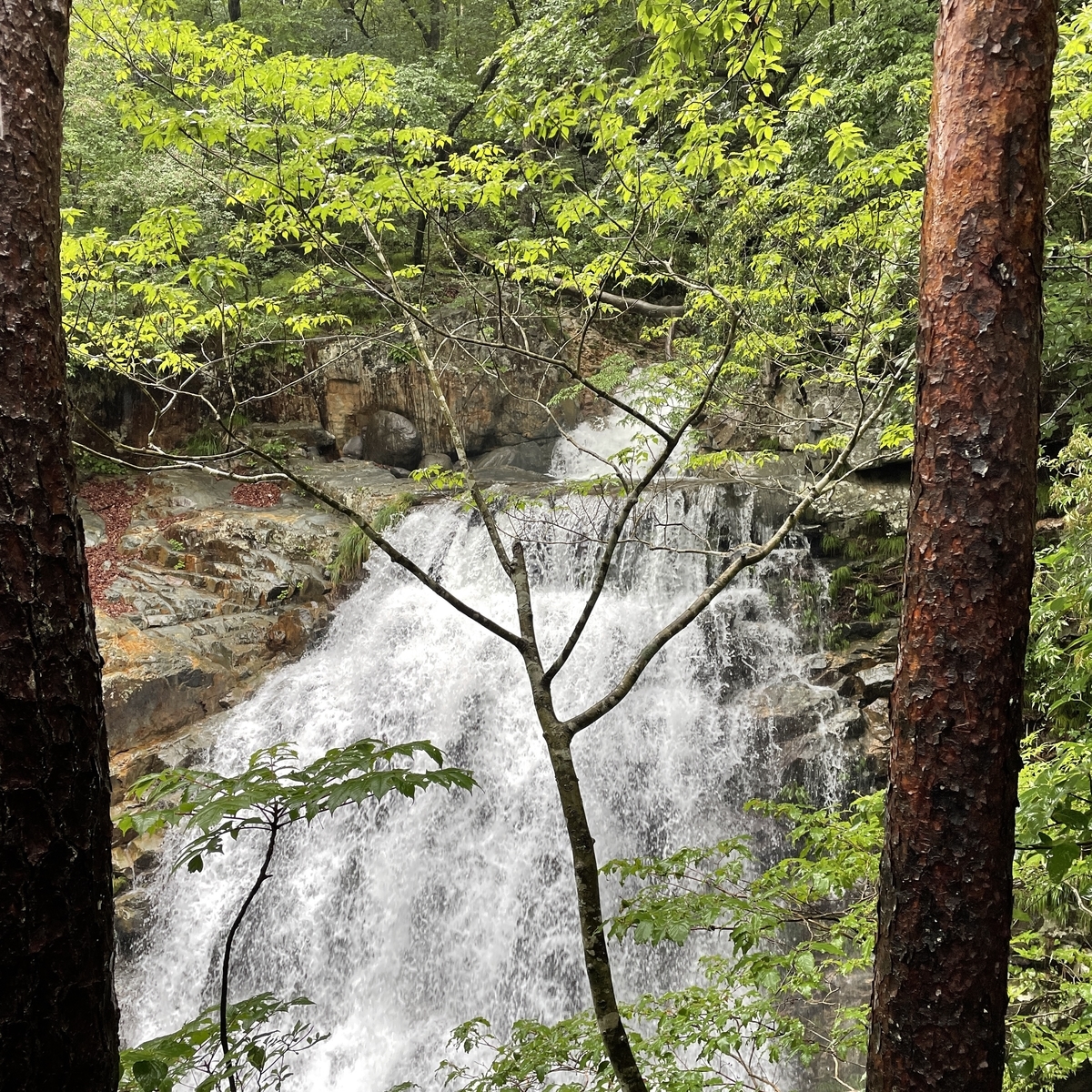 虹見橋からわずか700メートルという表記に騙されて向かってみると、山道を20分は歩く事に、、、道中には上りの階段下りの階段、川にかかった簡易的な橋など生い茂る盛の中をハイキングです。雨でぬかるんだ足元のため慎重に進むと20分ほどかかりました。