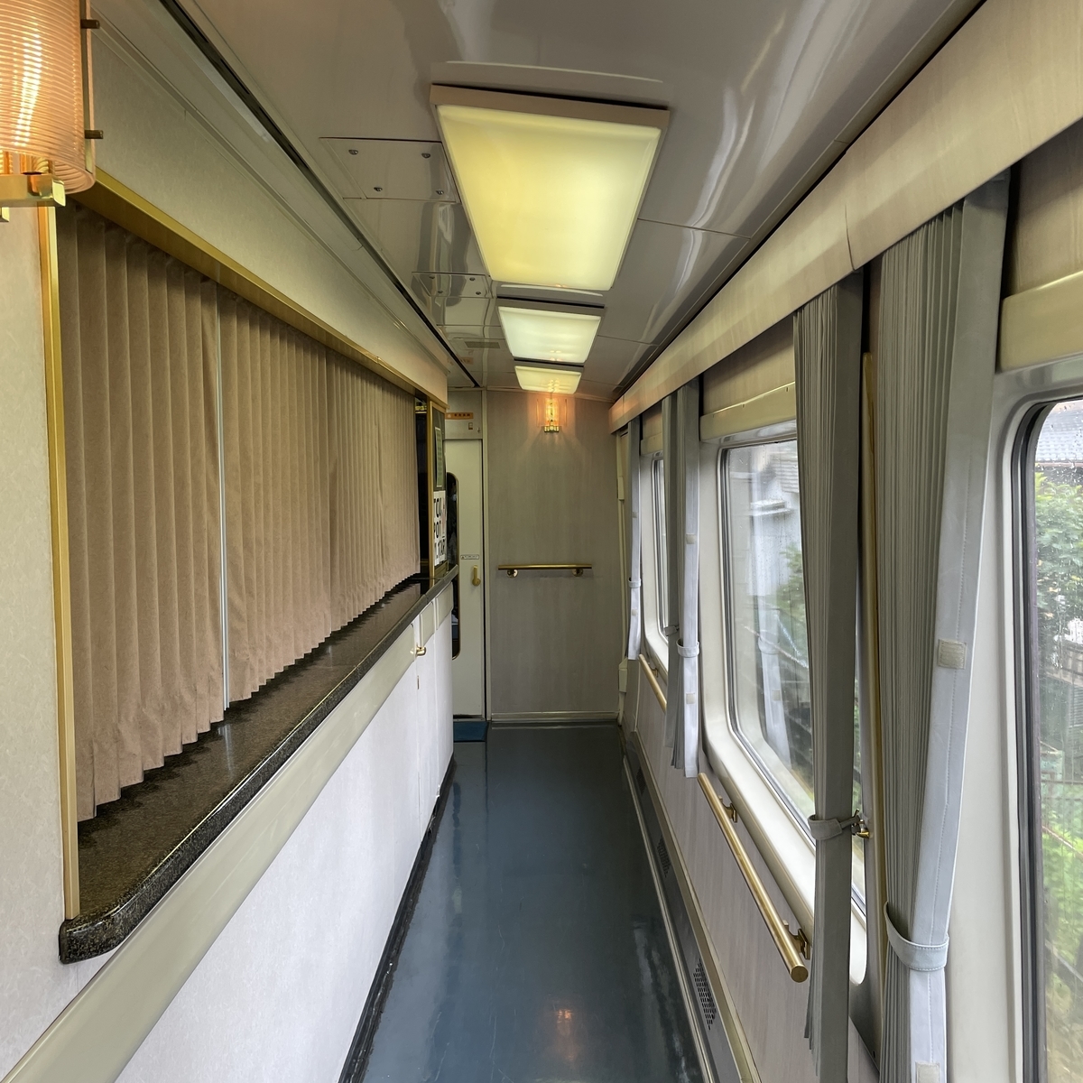 床は絨毯敷き、テーブルの縁にも金属があしらわれていて細かいところまで贅が尽くされていた電車ですね。