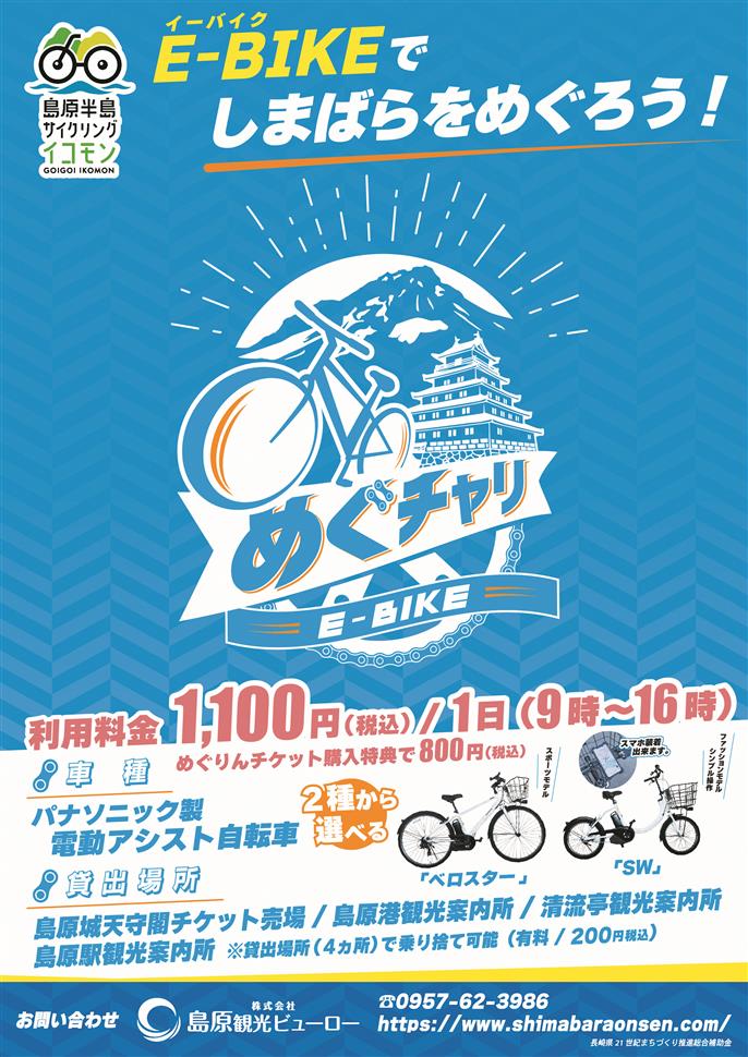 島原港の観光案内所にて電動自転車をレンタルできます。1日1,100円と少し高いですが、後述するめぐりんチケットを購入すると800円に割引されます。