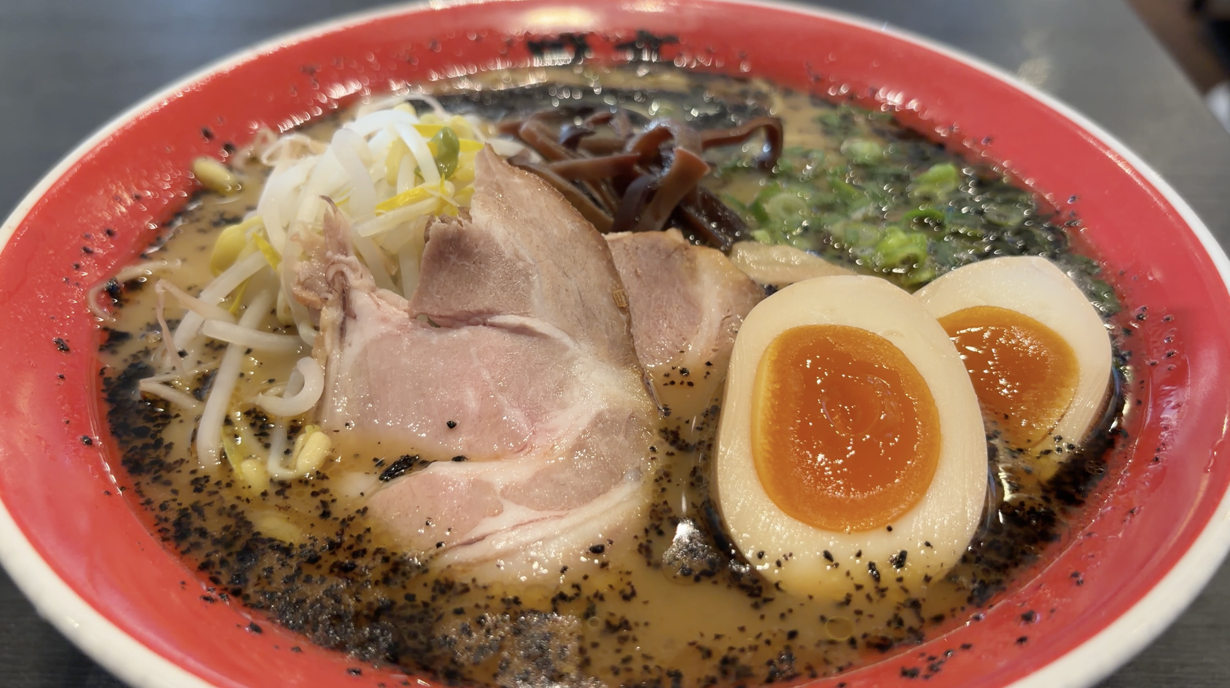 フェリーで熊本へ戻り、復路も無料の送迎バスで熊本駅へ戻ります。飛行機の出発まで時間があったので、熊本駅近くの黒亭でラーメンを食べます。焦がしにんにくの香ばしさが効いた一杯は、旅のラストを飾るにふさわしい力強さでした。