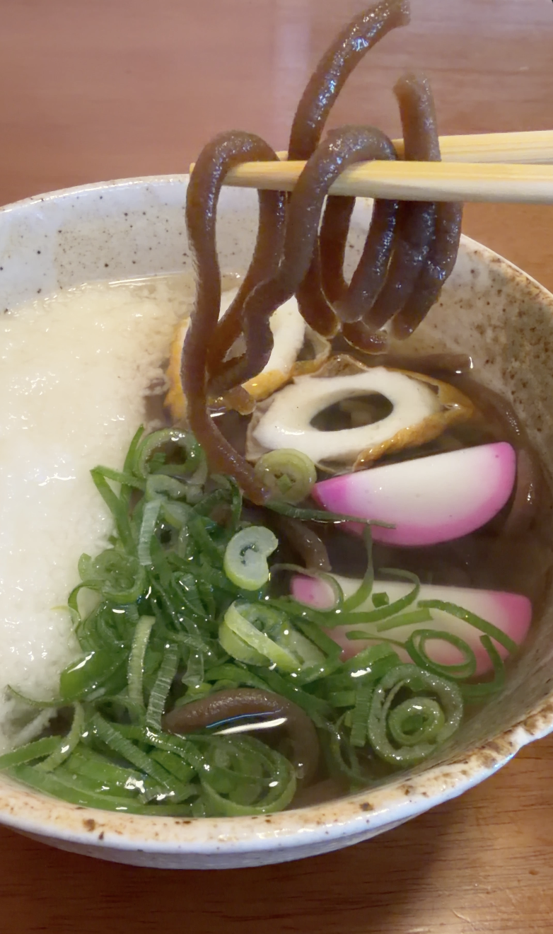 さつまいも澱粉を使った半透明の麺は、うどんとも違う独特の食感。つるりとしながらも、どこか素朴で滋味深い味わいが印象に残ります。自転車移動で体が冷えていたので、温かい麺は染み入る美味しさでした。派手さはないけれど、旅の記憶に静かに残る一杯。