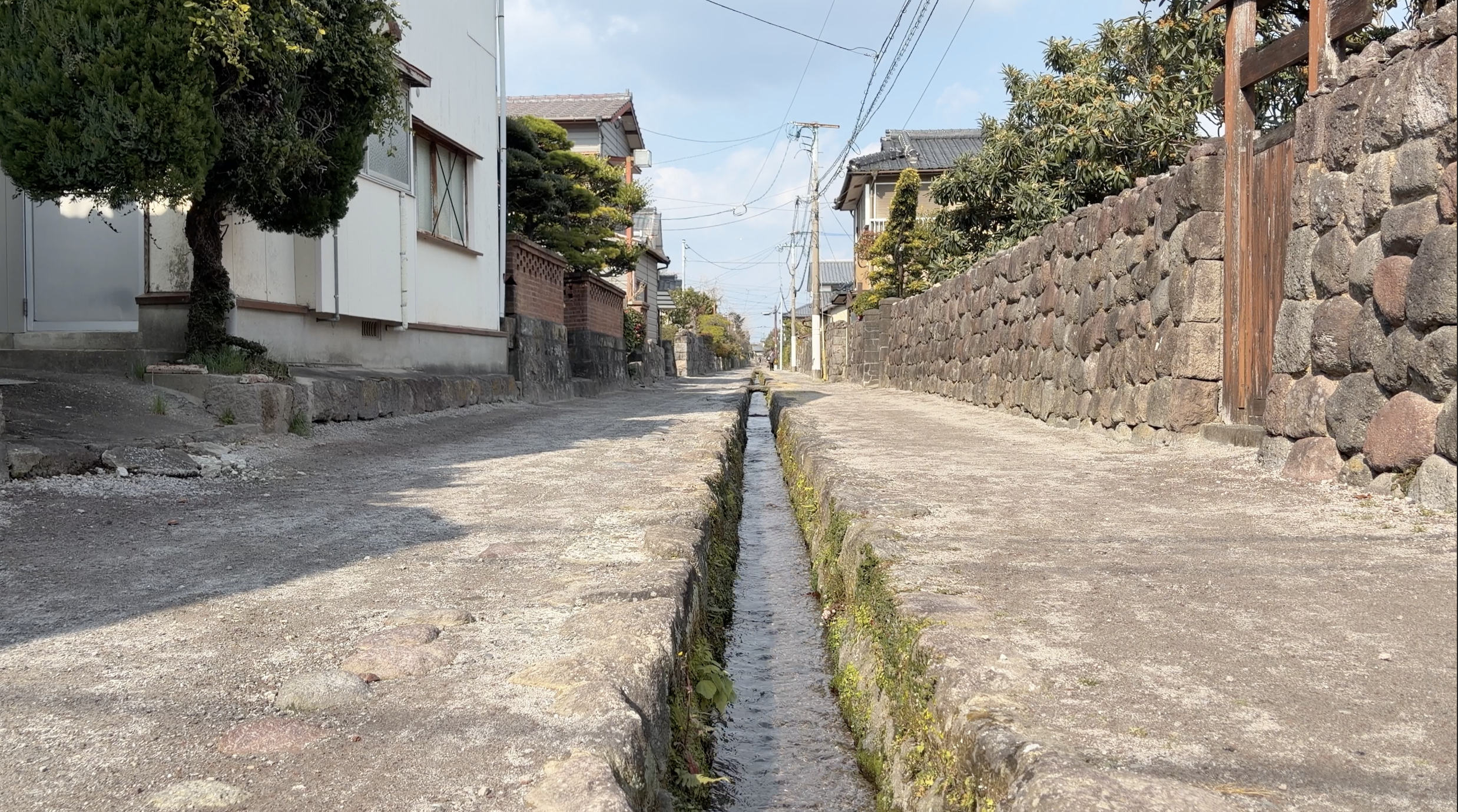 次に向かったのは城下町の面影を色濃く残す武家屋敷跡です。ここでは水路沿いに整然と並ぶ石垣と白壁が印象的です。観光地化されすぎていない静けさがあり、かつての住宅跡を辿る時間は、まるで時代を巻き戻すような感覚になります。