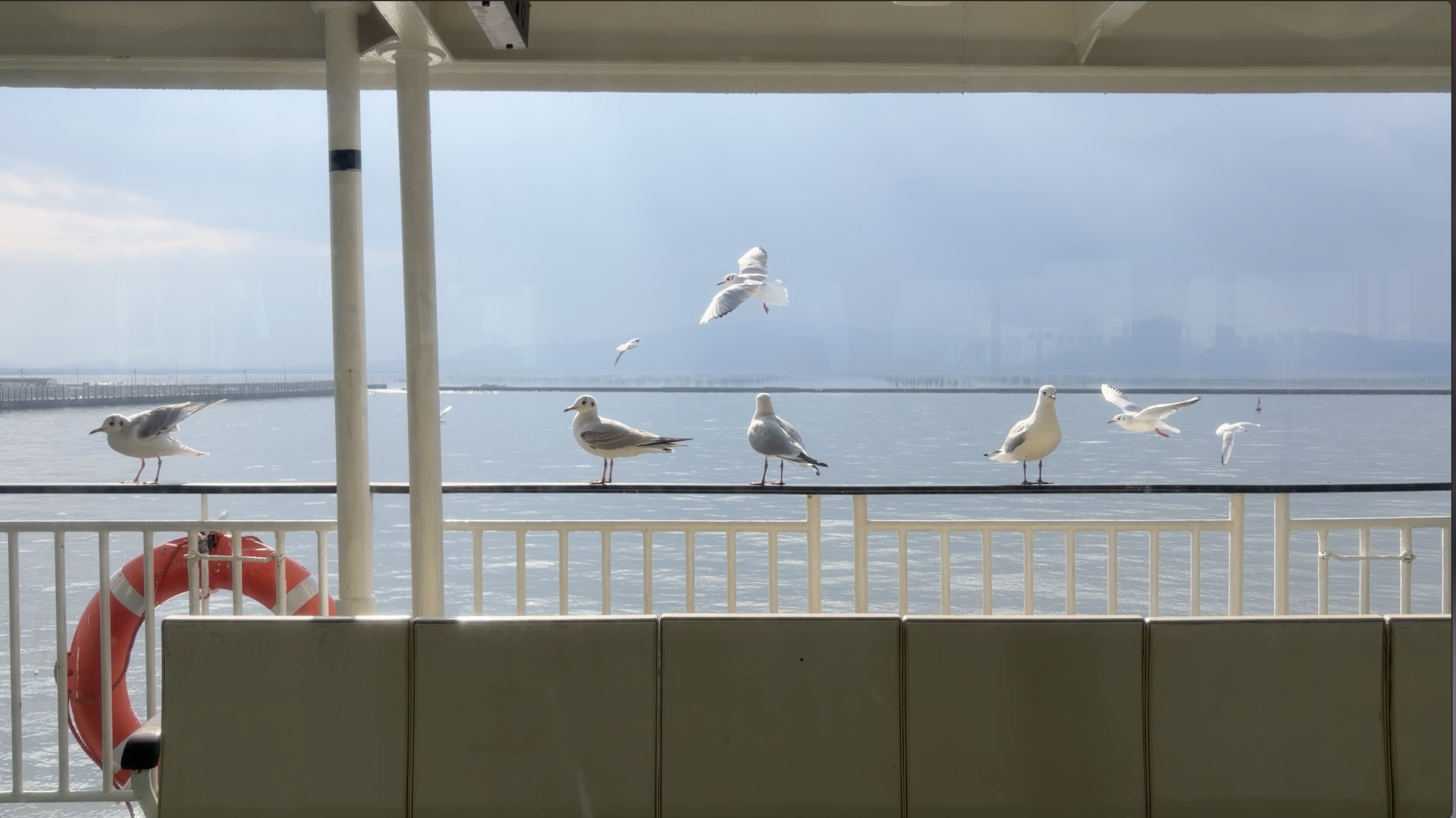 有明海を進むフェリーの甲板に出ると、想像以上の数の海鳥が船を追いかけてきます。潮風の中で羽ばたく姿は、ただの移動時間を「観光」に変えてくれる瞬間でした。船内で販売されているお菓子を上げている乗客もいるので、海鳥がぞくぞくとやってきます。
