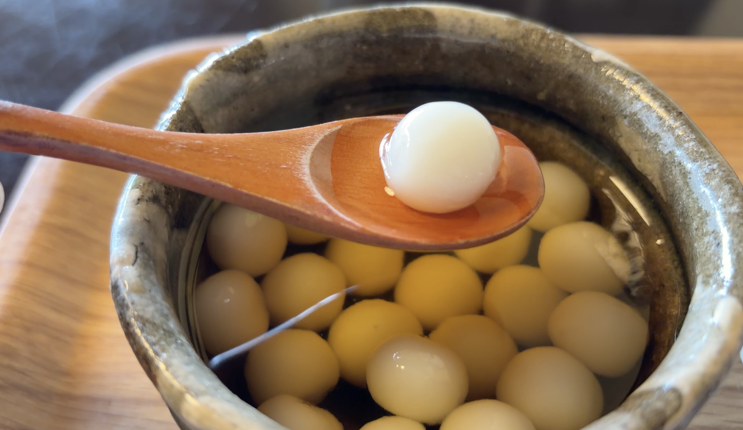 ここで島原の湧水文化を象徴する甘味「かんざらし」をいただきます。白玉を蜂蜜シロップに浮かべた涼菓で、素朴ながら後を引く味わいです。島原の湧き水で作る白玉はぷりぷりで噛むともちもち、シロップと一緒に食べる独特なメニューです。