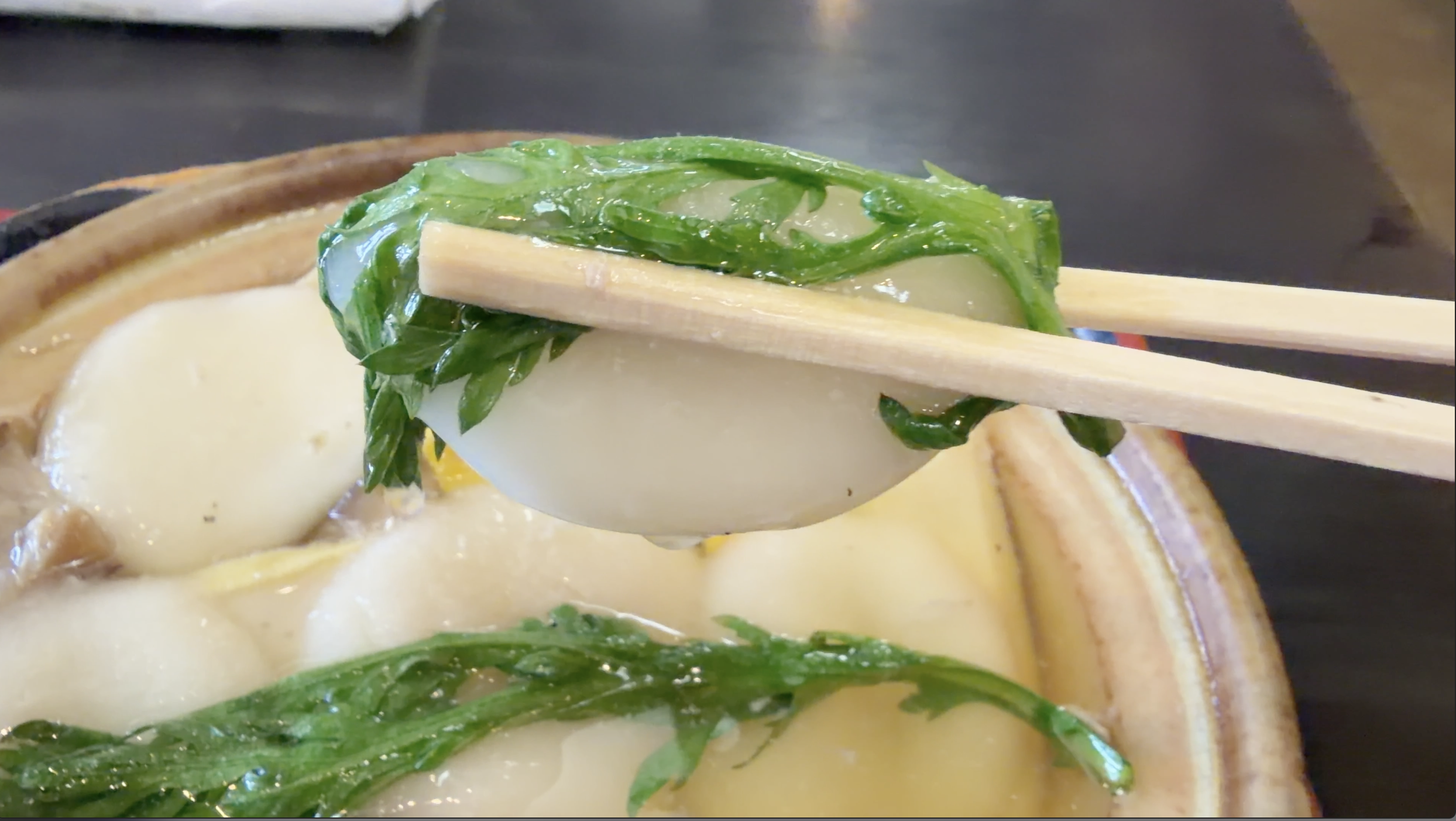 たくさんのお餅と根菜、しいたけや凍み豆腐、春菊など具材の多さは見た目以上で、ひと口ごとに異なる風味が楽しめます。