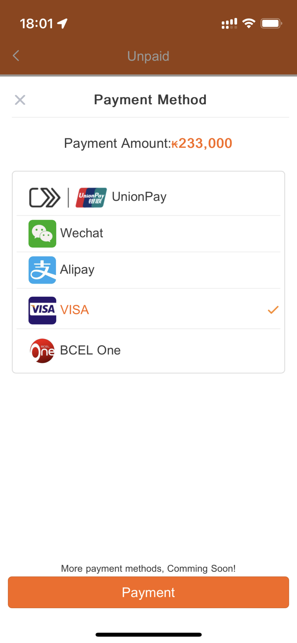 予約内容が表示されたら、日程などを確認してPaymentをタップします。決済方法は上記の5種類があります。中国アプリの決済が中心ですが、VISAでも利用できます。クレジットカードのセキュリティエラーになる場合は他のカードなども試してみましょう。