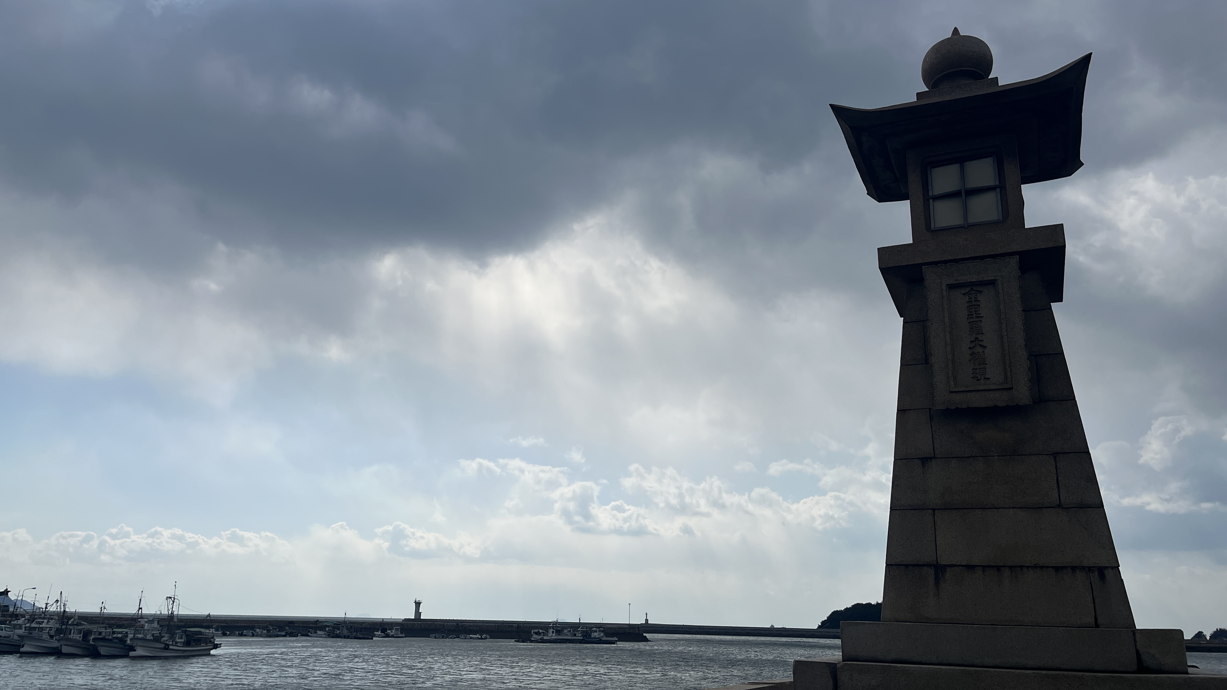 常夜燈の立つ港は、夕暮れ時がとくに美しい時間帯。海に沈む夕陽が家々の瓦屋根を金色に染め、まるで絵画のような光景です。