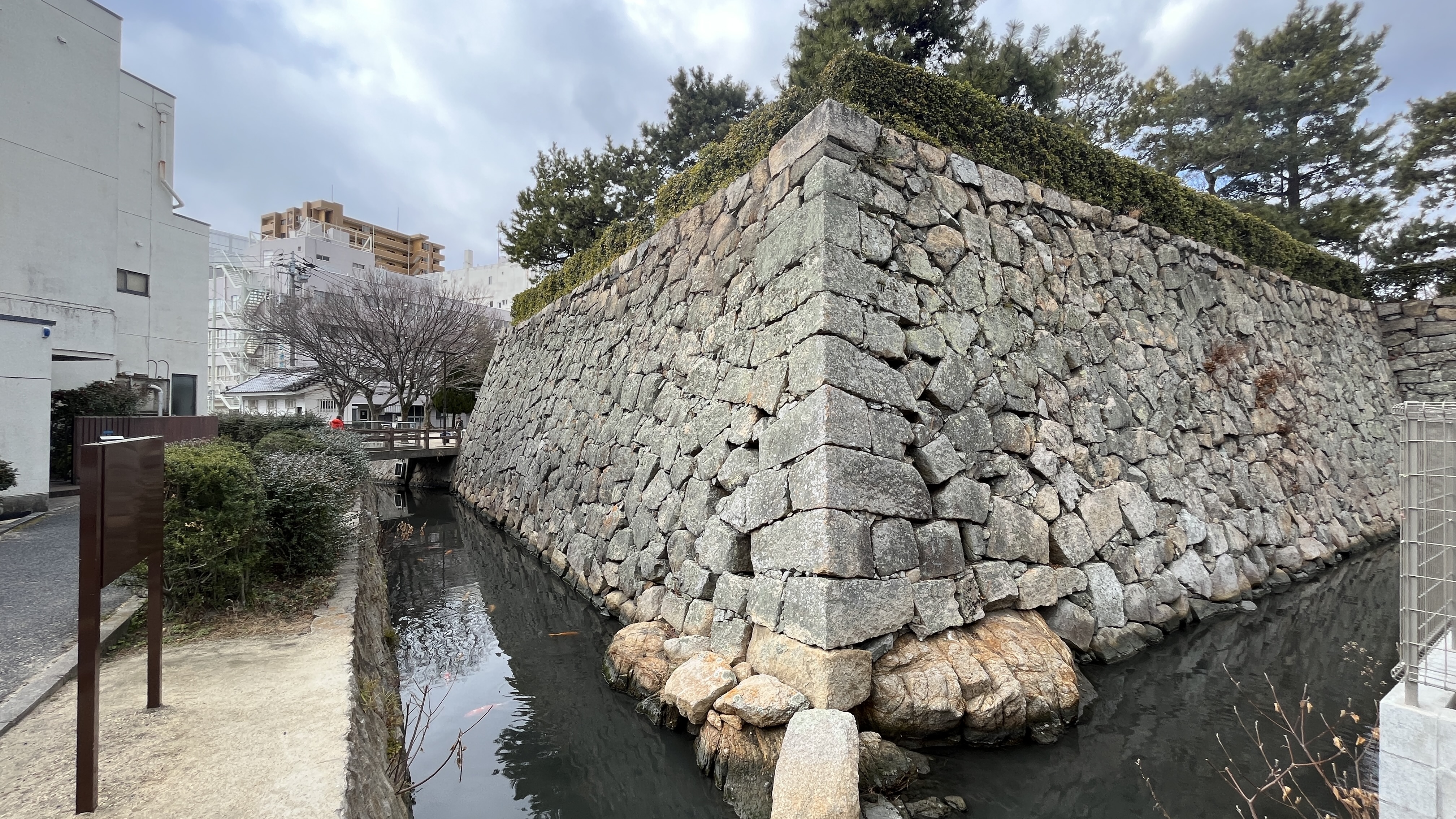 尾道からさらに西へ15分ほど、三原駅に到着します。駅のすぐそばには「三原城跡」があるというユニークな景観に出会えます。かつて瀬戸内海に突き出すように築かれた水城で、今も石垣や堀の一部が残り、当時の海城の姿をしのばせます。