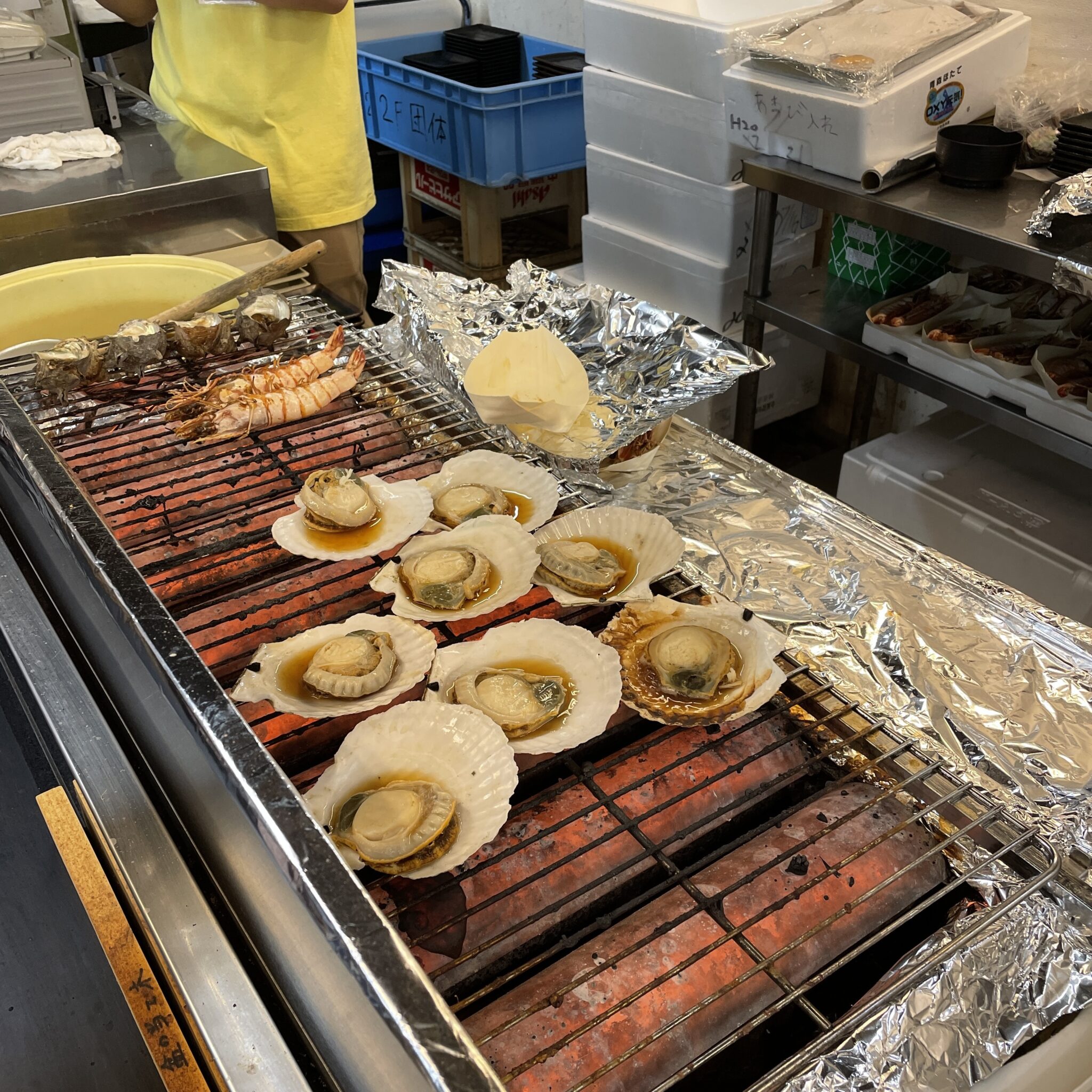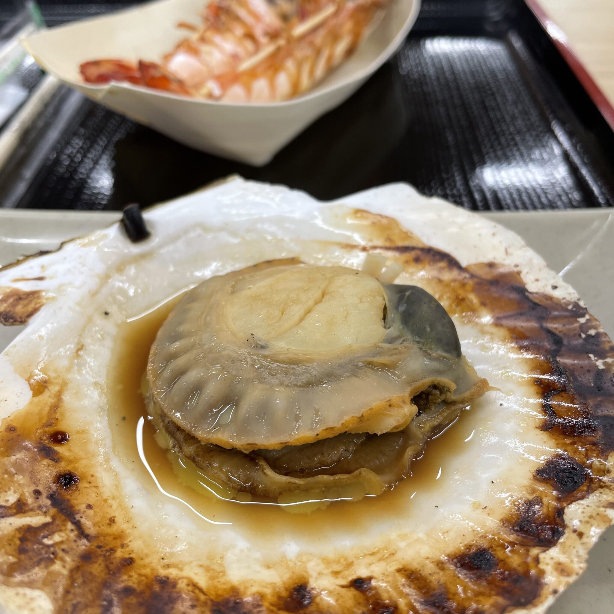 目の前で海鮮焼きをしているお店がフードコートにあります。焼き立てを買ってすぐに食べられます!