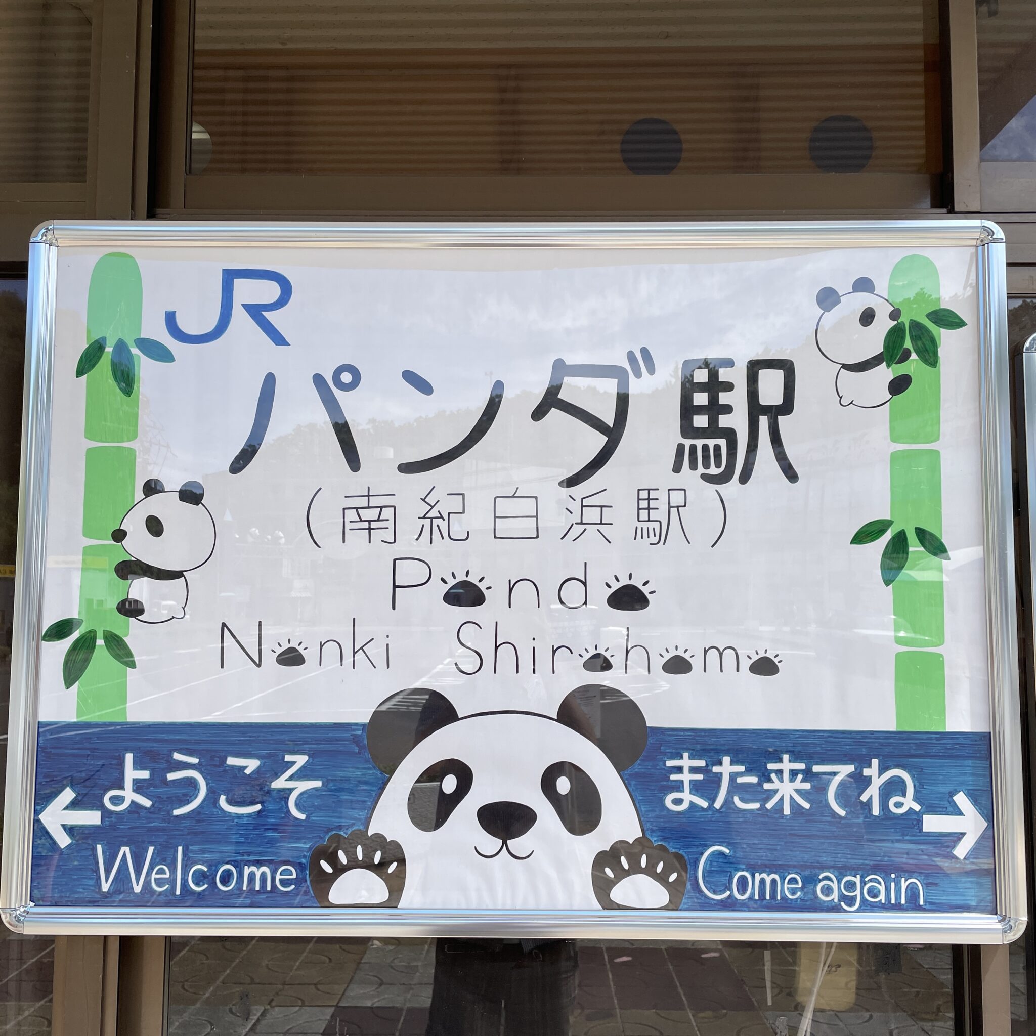 白浜駅へ帰ってきました! 駅の中もパンダ一色。隣には観光案内所と売店も併設していて、列車の時間まで寛ぐことができます。