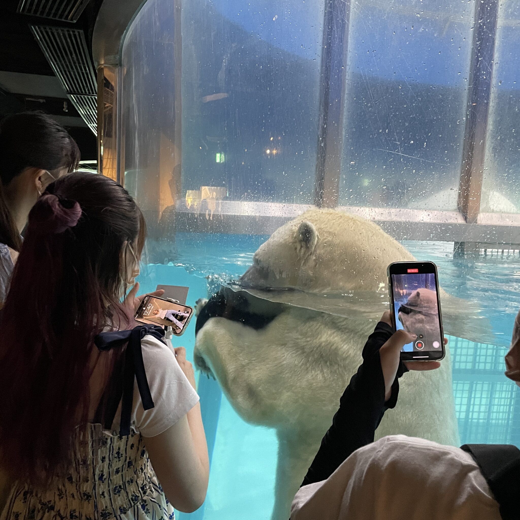 巨大なシロクマもタイヤの遊具でイキイキと遊ぶ様子がガラス一枚向こうで見ることができます。他の動物園では寝ているだけのシロクマも、アドベンチャーワールドでは、楽しそうに動いているので、みんな興奮していました。