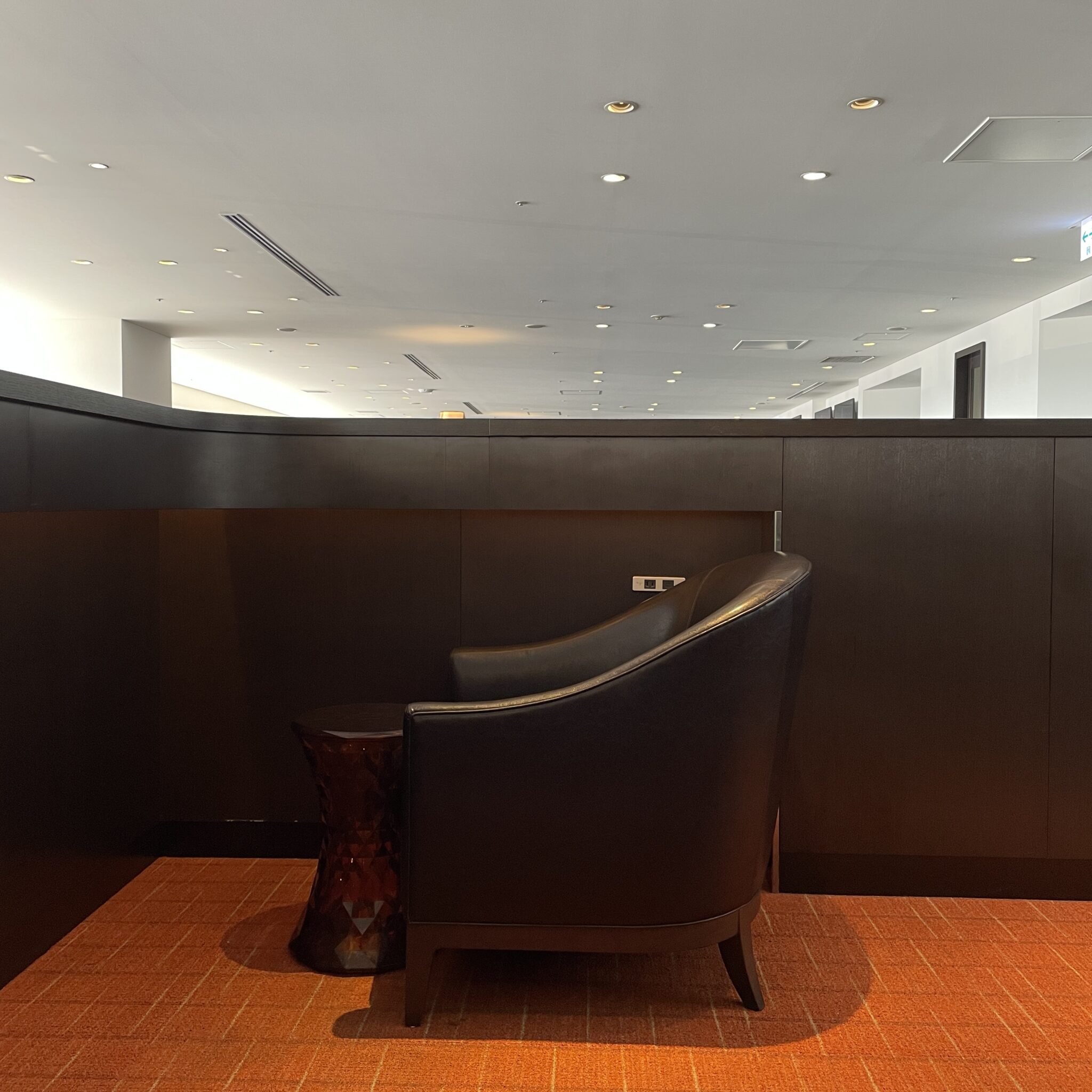 JALのラウンジは広い空間に多くの種類の座席が配置されています。とくにこちらの座席は周りが壁に囲まれており、ちょっとしたプライベート空間になっています。