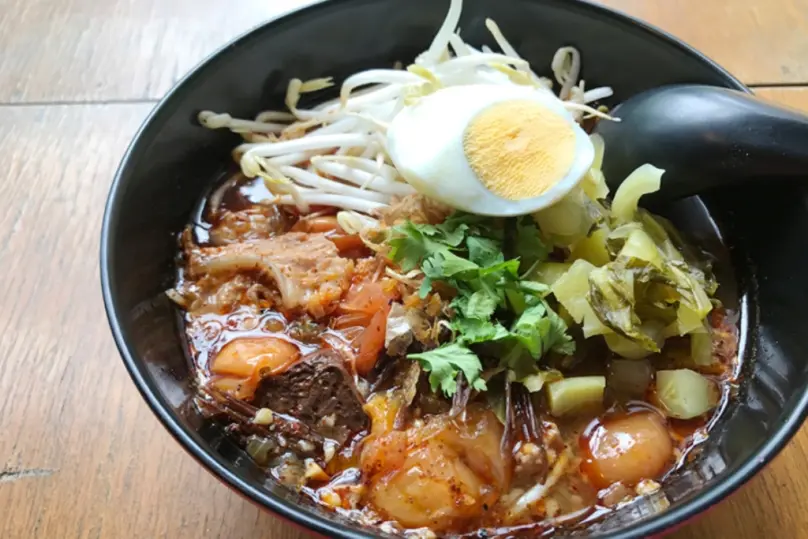 カオソーイ(ข้าวซอย:Khao Soi)はチェンマイを代表する料理で、ココナッツミルクを加えたカレーヌードルです。クリーミーなココナッツミルクとスパイスが絶妙に組み合わさり、独特の風味が楽しめます。揚げた麺と茹でた太麺の食感を同時に味わえるのも面白いです。