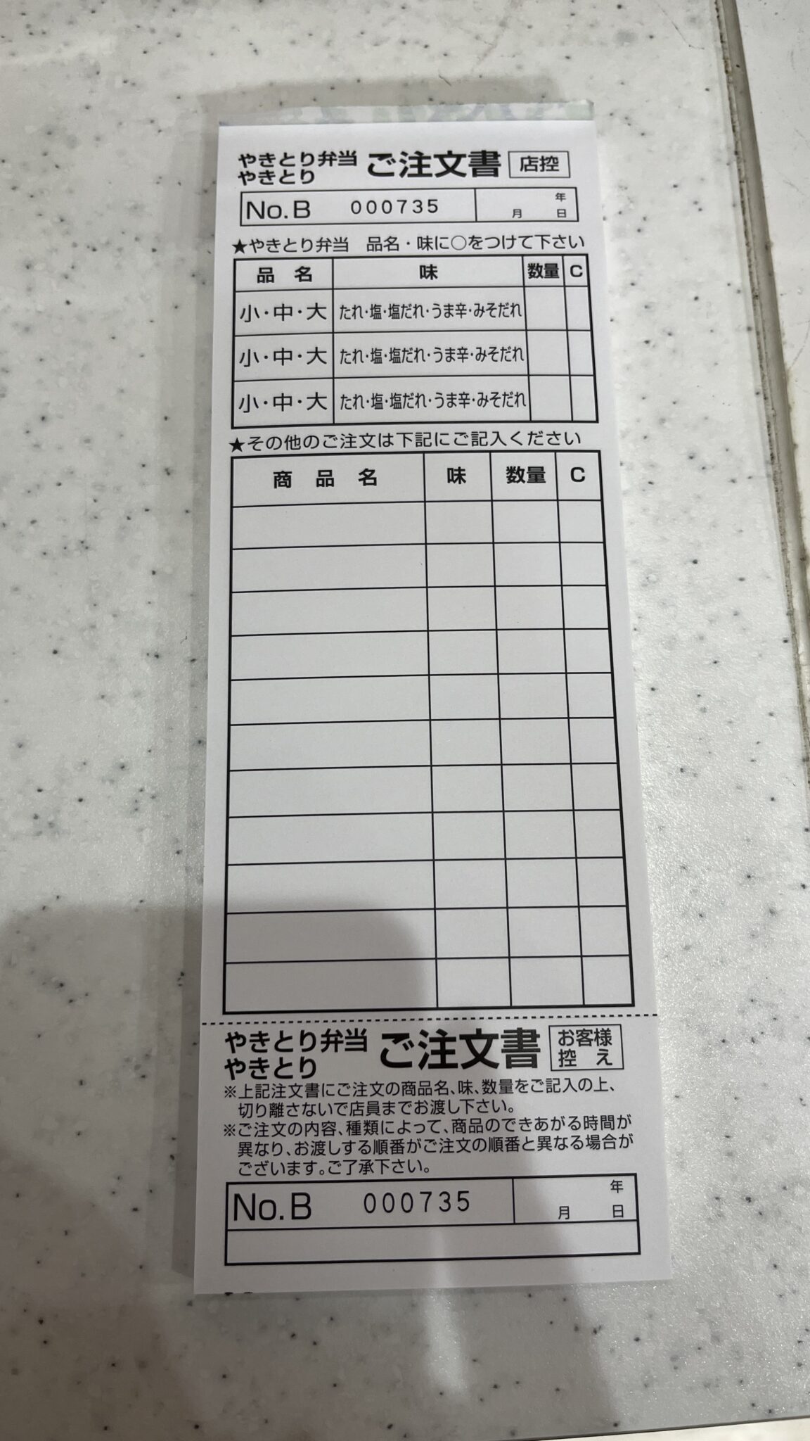 - メニューを見ながら注文用紙に品名・個数・味付けを記入する