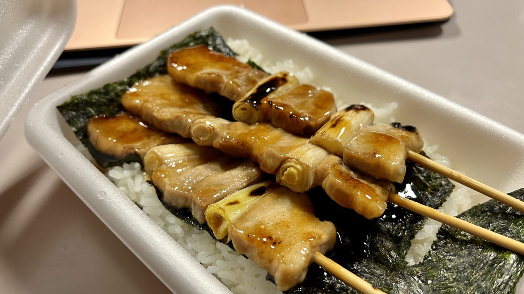 ハセガワストアのやきとり弁当を美味しく食べるには作法のようなものがあります。串に刺さったやきとりですが、弁当箱の縁にある隙間にひっかけて抜くとお肉だけが弁当に残って豚丼のようにすることができます。