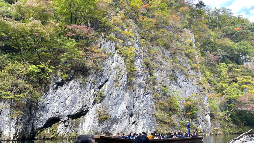 この猊鼻渓川下りは、人力の船に乗って川を下るのだけでなく始めに上ります。 船頭さんの舵一本だけで悠々と進んでいく舟捌きには驚きです。
