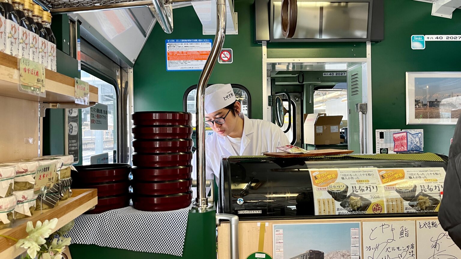 内容は新鮮や富山の寿司5貫と富山の一品、氷見のはと麦茶で2,500円と少々値が張りますが、それでも車内でにぎりたての寿司を食べれるという体験は貴重なものではないでしょうか。