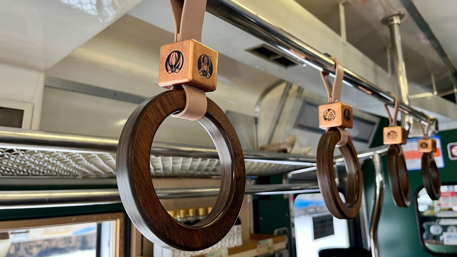 つり革は高岡銅器をイメージした作りになっており、固定する木材は沿線4市のイメージが彫られています。柔らかい印象の木でさわり心地のよいつり革になっています。